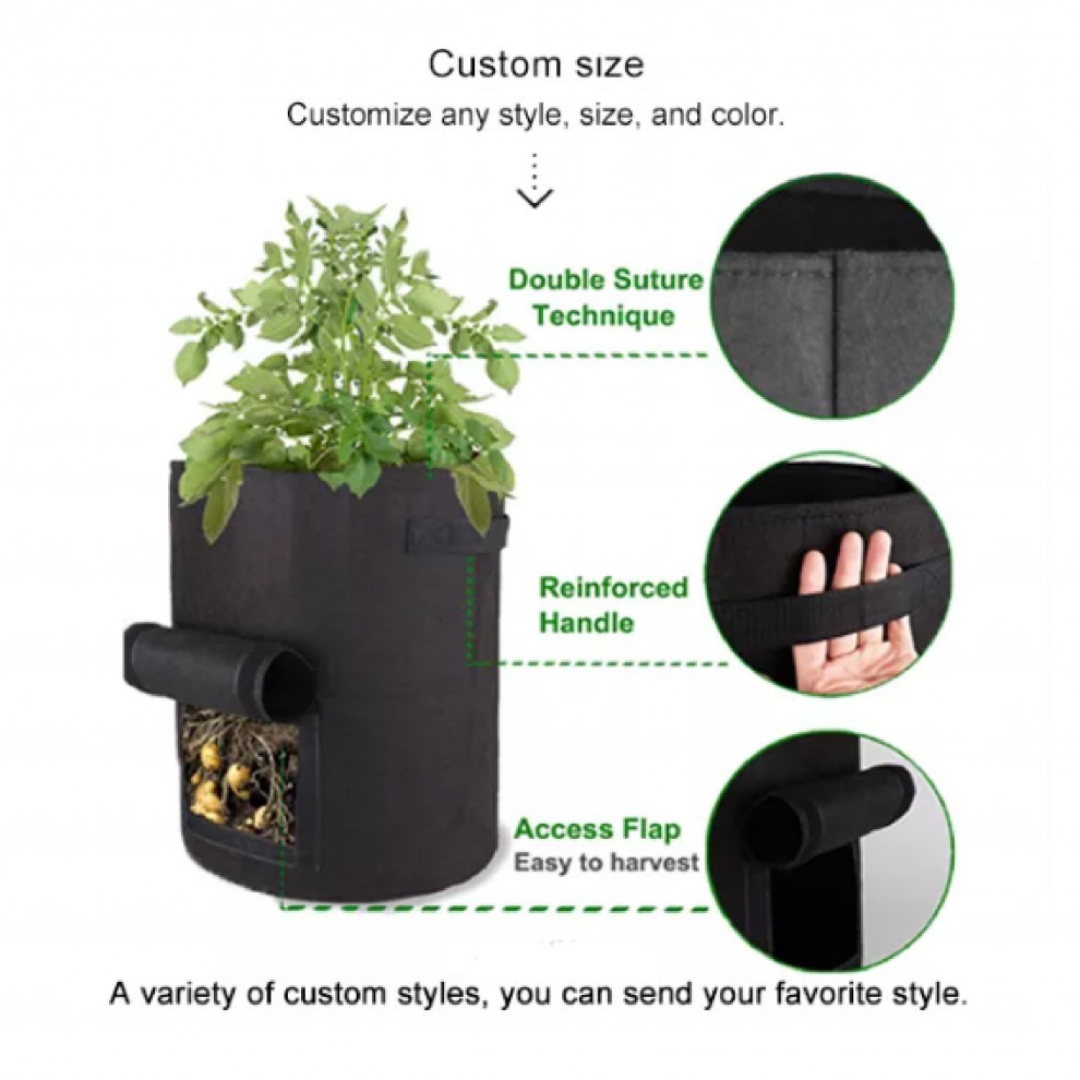 كيس سمارت لزراعة البطاطس والنباتات التي تنمو على شكل جذور كالزنجبيل والكركم خيث يمكن الكشف عن النمو من خلال الفتحة الموجودة بالكيس دون المساس بالتربة أو ازالة التربة من أعلى
