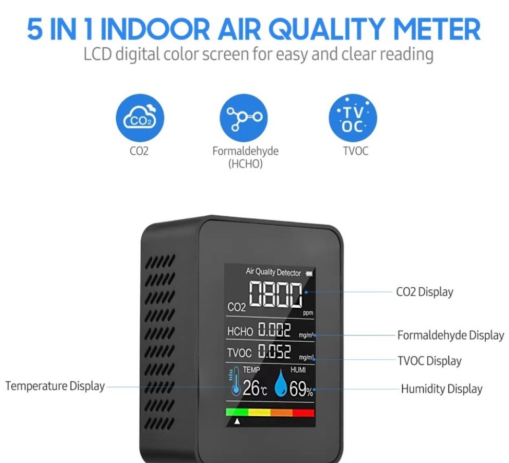 يعرض هذا الكاشف تركيز HCHO و CO2 ودرجة حرارة ورطوبة البيئة.